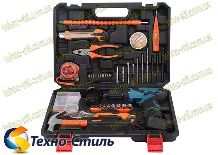 Аккумуляторная модель шуруповерта поставляется в наборе с совместимыми аксессуарами. Стандартная комплектация включает пассатижи, измерительную рулетку, сверла, гибкий переходник и прочие полезные приспособления.
