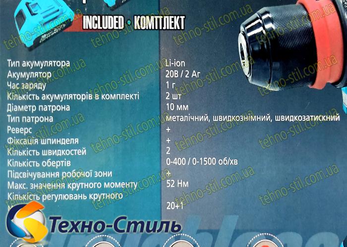 Бесщеточный, съемный патрон 10 мм, с Li-ion аккумуляторм 20 В/2 А/ч