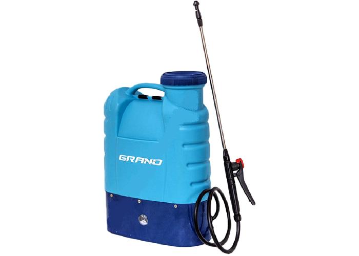 Садовый аккумуляторный опрыскиватель Grand АО-16 представляет собой устройство, состоящее из расходного бачка, помпового насоса, ёмкой аккумуляторной батареи, шланга подачи и распылителя. Жидкость из бачка под собственным давлением попадает на мембрану помпы, которая в свою очередь, нагнетает ее через форсунку распылителя. При этом создается давление 0,15-0,4 Мпа, которого достаточно для получения струи до 12 м.