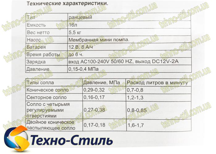 - Бак вмещает до 16 л раствора, поэтому его не придется лишний раз доливать и тратить на это время, будет достаточно лишь одной заправки; Работает от аккумулятора долгое время, а также укомплектован особым зарядным устройством: оно подойдет не только для самого опрыскивателя, но и для других приборов, рассчитанных на мощность в 12В;
