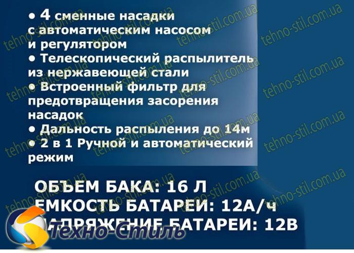 купить опрыскиватель с встроенной аккумуляторной батареей. Он работает в двух режимах – автоматическом и ручном. Дальность распыления агрохимии составляет около 14 метров. Этому способствует уникальная конструкция телескопической стальной штанги, которая совмещается с соплами различного назначения. Помимо насадок, в стандартной комплектации поставляются адаптер для быстрой зарядки от бытовой сети 220В.