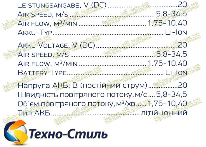 - Напряжение АКБ: 20 В