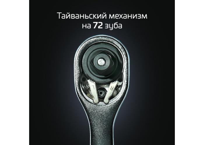 В наборе представлены все необходимые аксессуары – шестигранные головки различных диаметров, насадки для доступа к крепежам, расположенным в углублениях и под углом, свечные головки с улавливателями для обслуживания системы зажигания. Также имеются в комплектации воротки, удлинители, реверсная трещоточная рукоять, кардан.