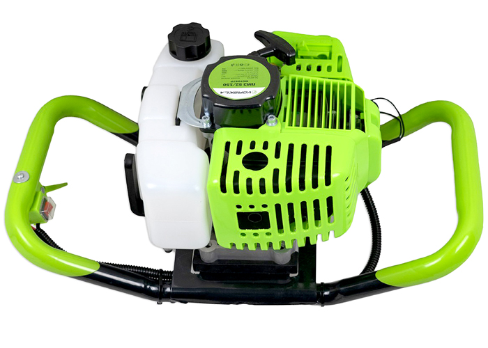 К редукторному валу крепится бурильный элемент - шнек. Также установка обладает баком 1,2 л, ручным стартером запуска, и удобно размещенными на раме органами управления.