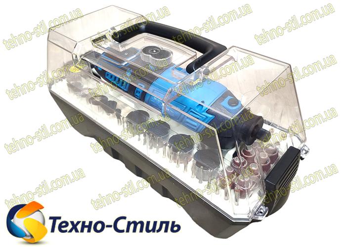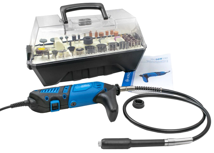 В комплекте: 190 насадок, гибкий вал, дополнительная рукоятка-подставка