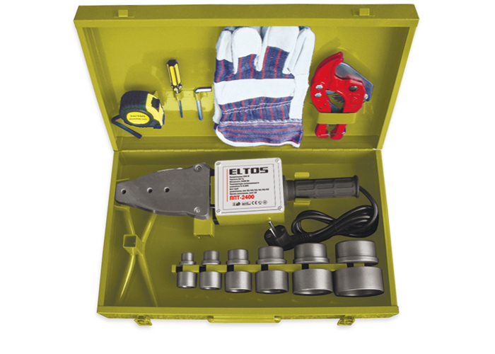 Заказать и купить прибор ППТ-2400 Eltos можно в комплекте со специальными насадками под стандартные размеры труб 20-25-32-40-50-63 мм. Для спайки необходимо выбрать соответствующую насадку под нужный диаметр. Включить устройство в сеть 220 В и в течении 5 минут дать устройству нагреться. Зафиксировать термоэлемент прибора на месте стыка полипропиленовых деталей, подождать 10 минут. В итоге, получится аккуратное, герметичное соединение, монолитного типа.