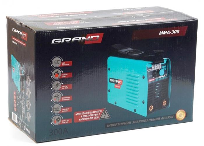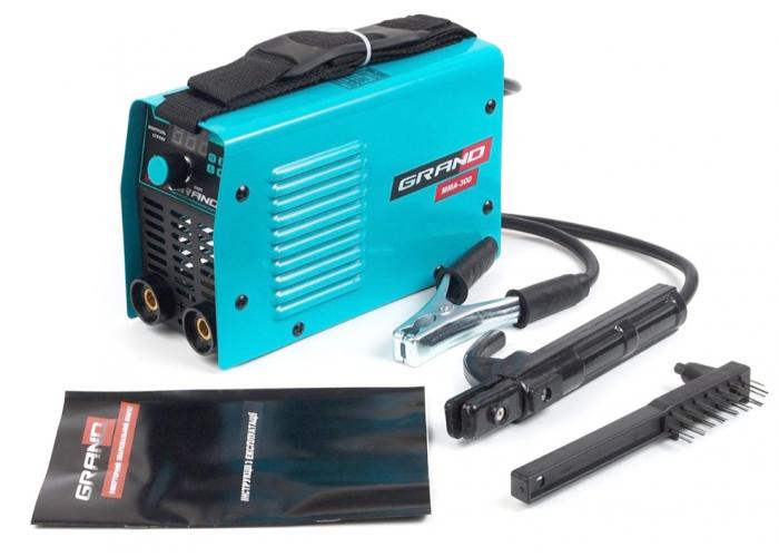 Комплектация: Сварочный аппарат Grand ММА-300 (дисплей), щетка металлическая, кабель сварочный, кабель с электродержателем, картонная упаковка.