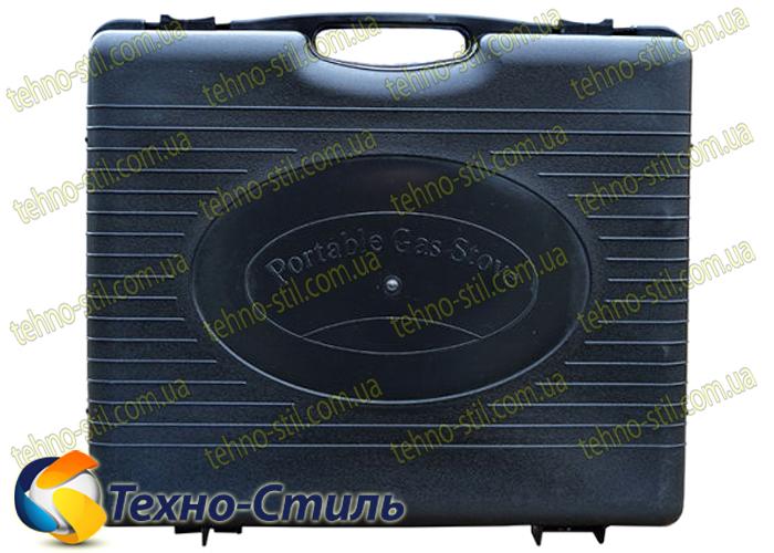 Газовая плита упакована в пластиковый ящик с ручкой для удобства транспортировки и безопасного хранения.
