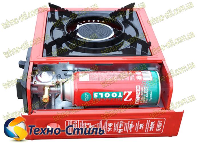 Работает от газового баллона 227 г, помещенного внутрь плиты, или от бытового газового баллона через адаптер (входит в комплект).