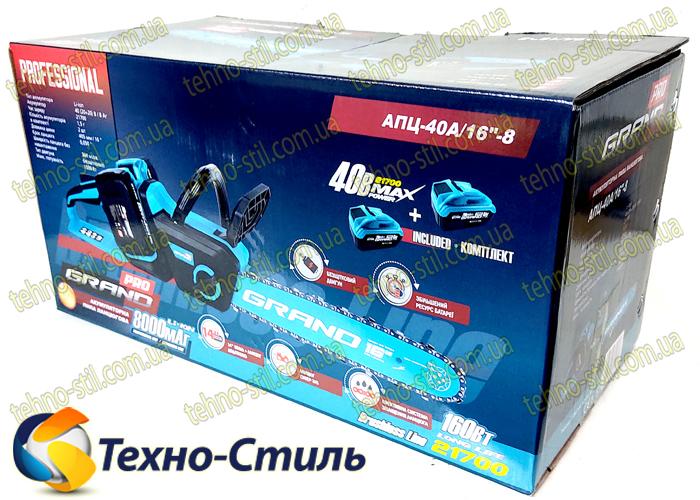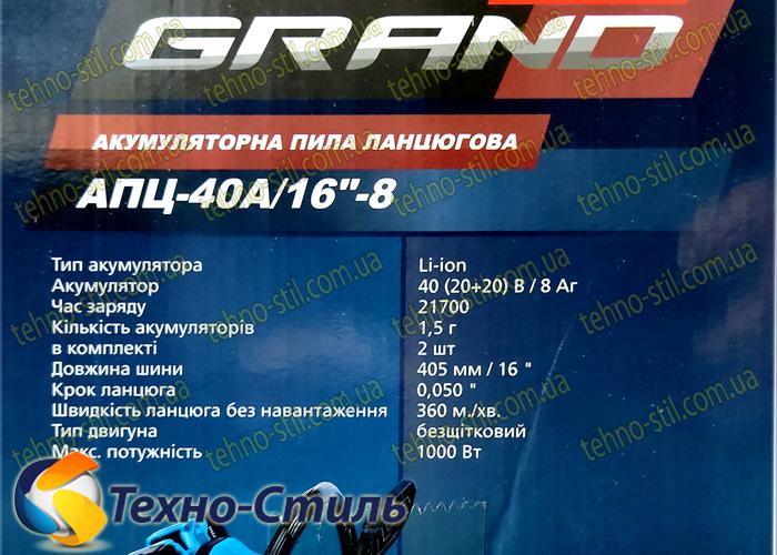 - Аккумуляторная цепная пилка Grand АПЦ-40А/16-8 отличается высокими параметрами производительности, мощностью, хорошими показателями работоспособности.